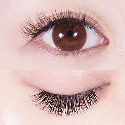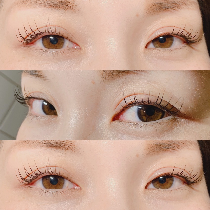 自まつ毛を最大限に長く見せます。なかなか綺麗に上げきれない目頭と目尻も根本からスッと立ち上げ。